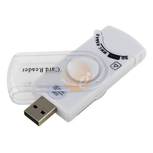 This USB 2.0 All In One SIM card / memory card reader is the ideal companion for your digital media. Avoid the hassle of carrying a bulky card reader in order to transfer photos, music, data and more between PCs. Compact and portable design. Cap is designed to close so you can store an extra memory card. Ideal for portable use on the road or at home with a desktop or laptop. Your data and pictures can be instantly transferred to your PC / Notebook. Instantly convert your SD / SDHC / MMC into a USB Flash Drive. Easily organize your contacts with the build in SIM Card reader. Features and Specifications: Hot-Swappable. Plug and Play. USB 2.0. Ultra High Speed-Read: 4.3Mbps, Write: 1.3Mbps. LED indicator lights. Supports Windows Vista, Windows XP, 2000, 98, and Mac OS 9.2 and higher. SIM Card. Color: White. Accessory ONLY. Memory card not included. Suggested Applications:Secure Digital. SD / SD Ultra. MiniSD (with adapter). MicroSD / TransFlash (with adapter). MMC. RS-MMC (with adapter). MMC Plus. MMC Mobile (with adapter). SIM Card